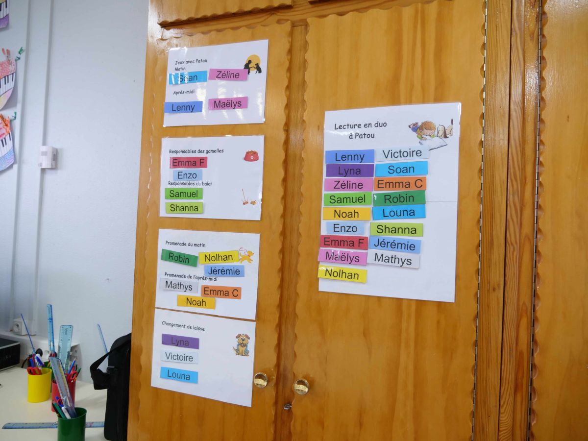 Deux jours par semaine, Patou devient un membre à part entière de la classe. Un tableau répartit les rôles : promenades, gamelles, brossage, balayage (Patou perd beaucoup de poils !), mais aussi lecture. Dans le coin bibliothèque, deux élèves s’installent près du chien pour lire à voix haute. « Lire à Patou, c’est un moment de plaisir, » explique l’enseignante. « Pour ceux qui aiment lire, c’est une récompense. Pour ceux qui ont plus de mal, c’est un moment de détente, sans jugement. »